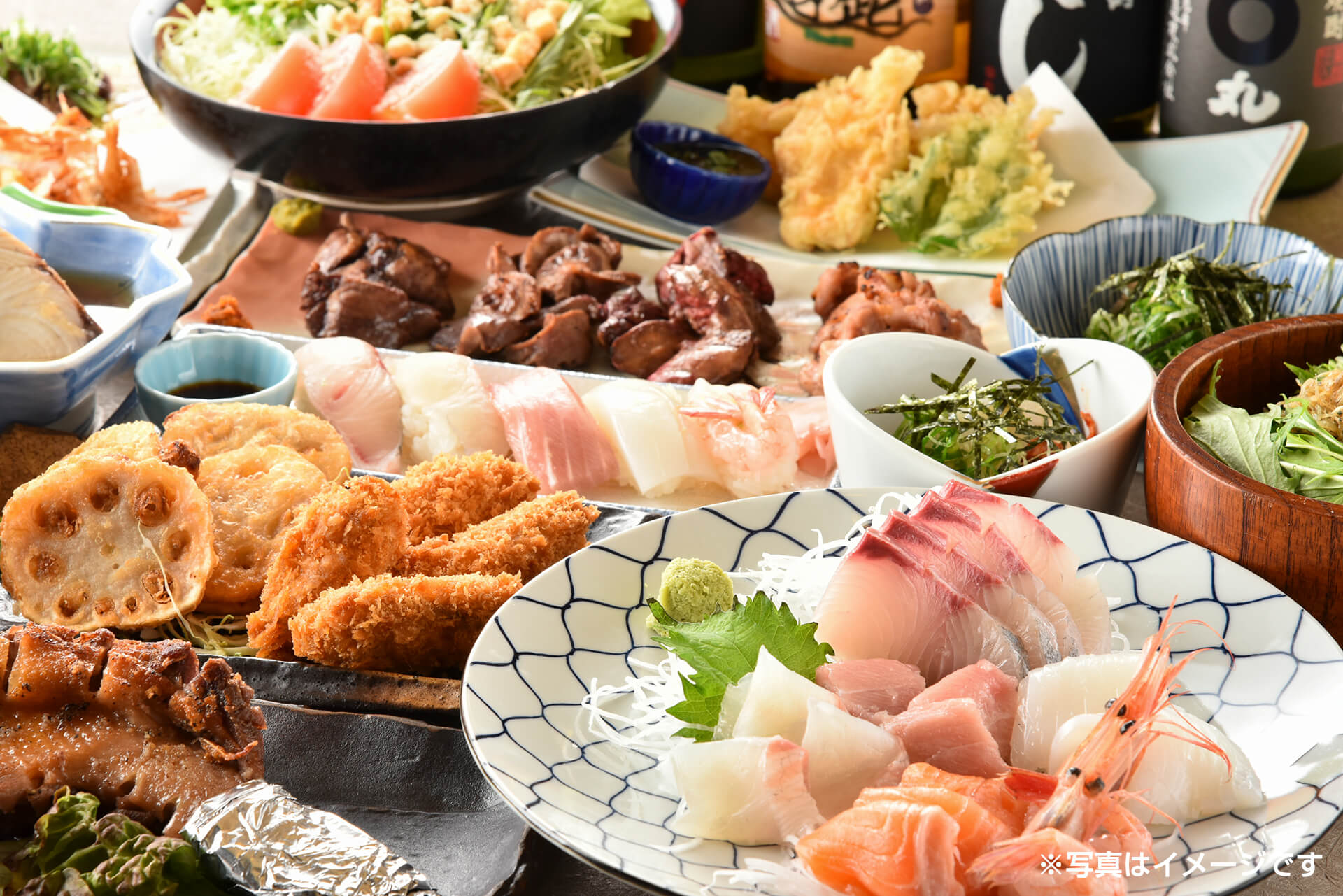 当店のご宴会コースは、お料理にご宴会用の飲み放題(120分)をお付けした『Aコース(5,000円)』『Bコース(5,500円)』『Cコース(6,600円)』からお選びください。